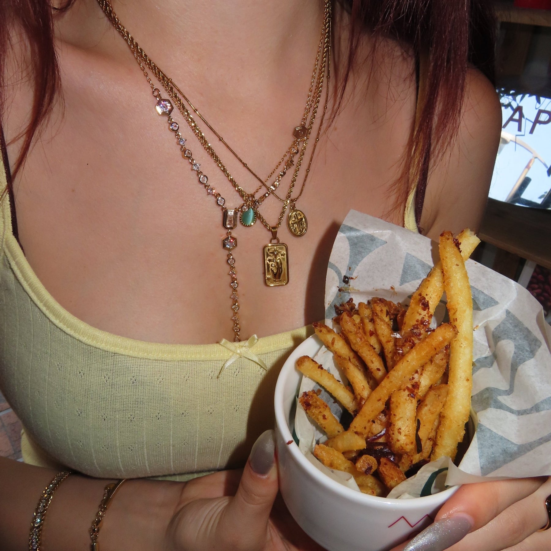 [DESIGN] This necklace beautifully adorns your dรฉcolletรฉ with its delicate sparkle. TheY-shaped design with its string of jewels adds a touch of elegance to your neckline while making it look delicate.It's a versatile piece that can be worn on its own or layered for a stylish look.