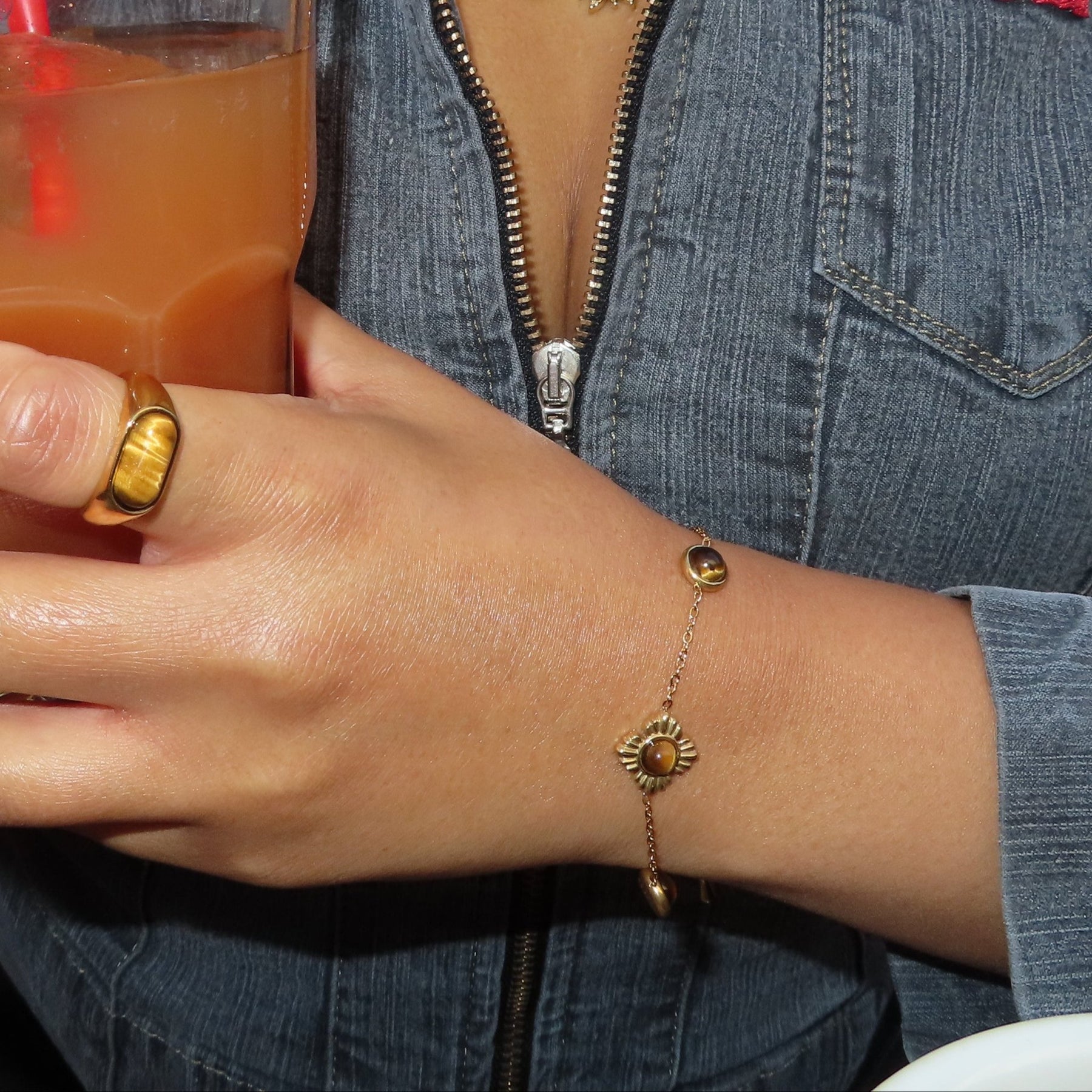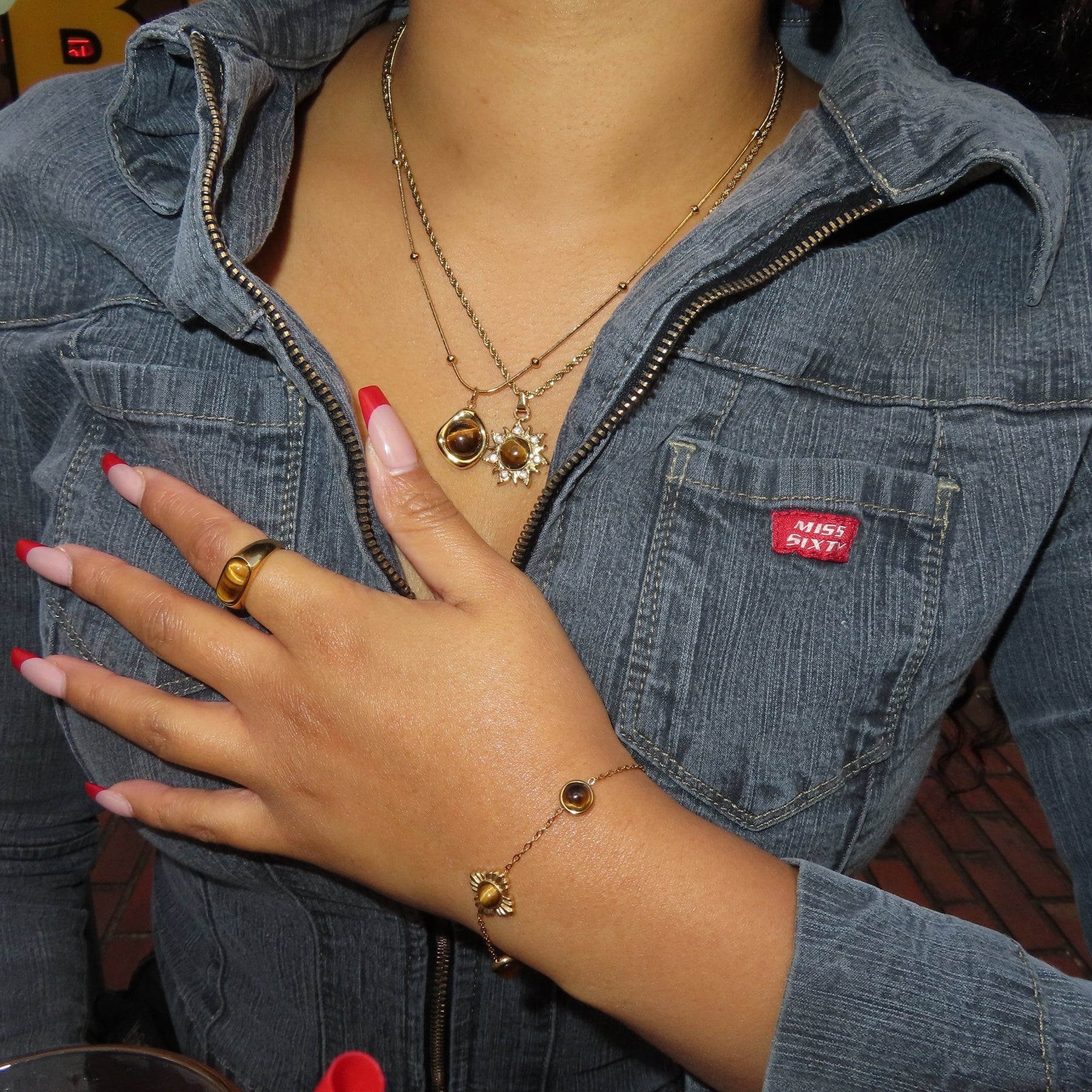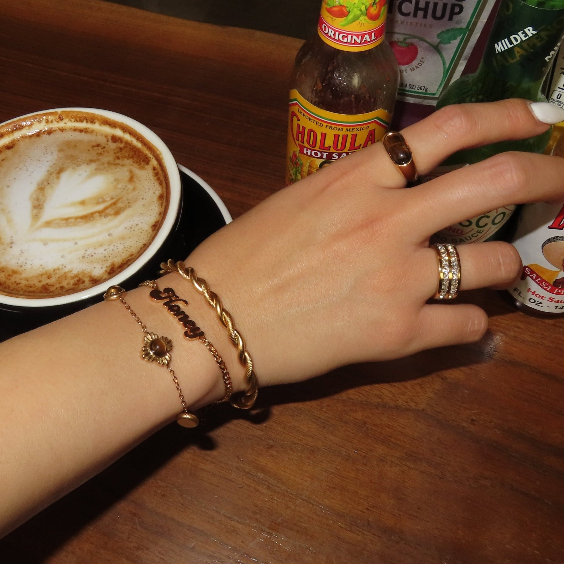 [DESIGN] It's also cute to match it with a tiger eye tiger ring! The gold and brown of the stone harmonize to create an elegant and calm atmosphere. Combine it with other gold items as shown in the picture to create a more trendy look.