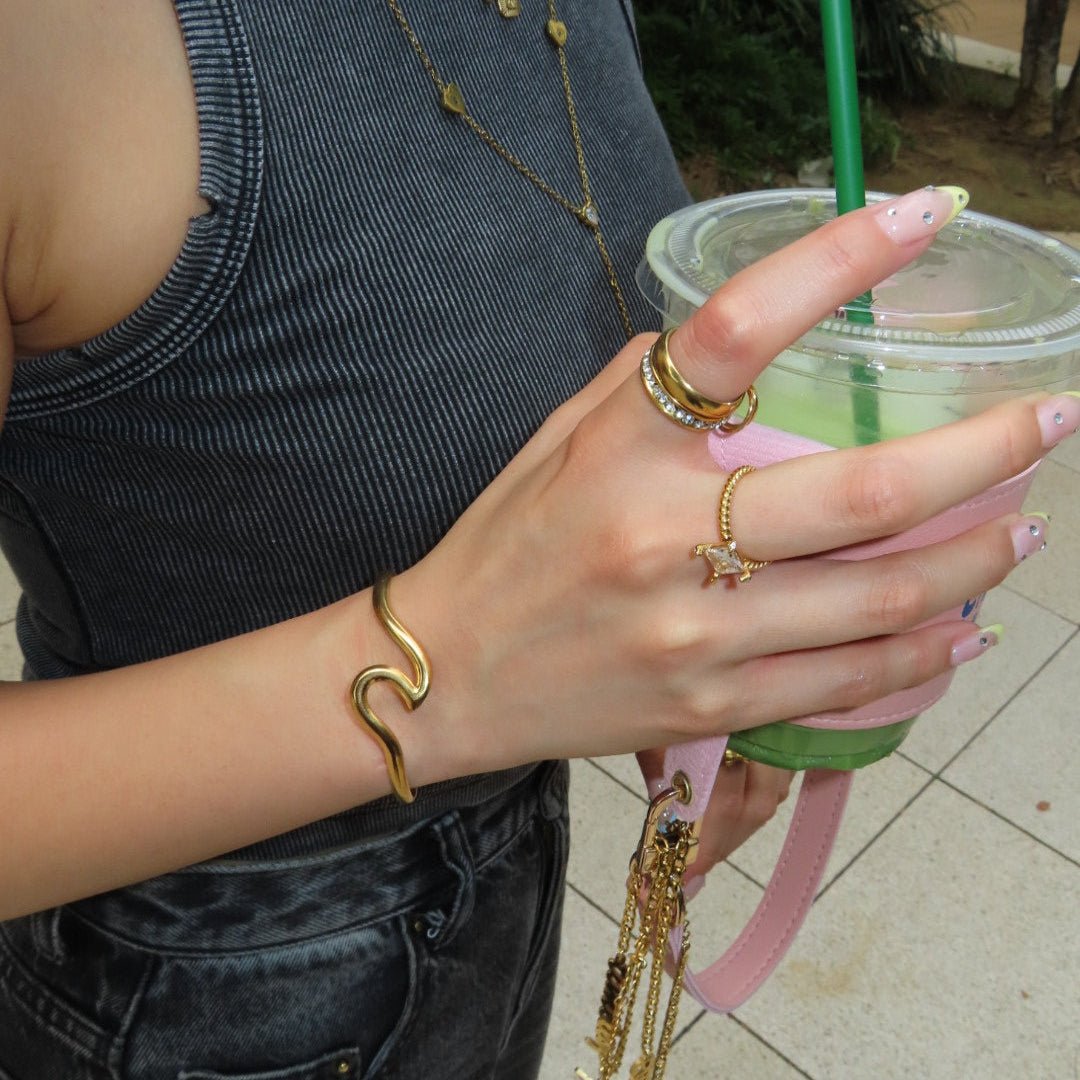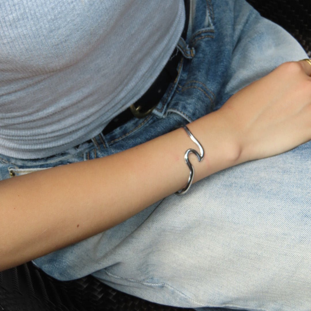 [DESIGN] This wave-shaped bangle comes in two colors. It stands out even when worn alone, making it the perfect item for the beach. The size is adjustable, so it's perfect for couples to wear together.
