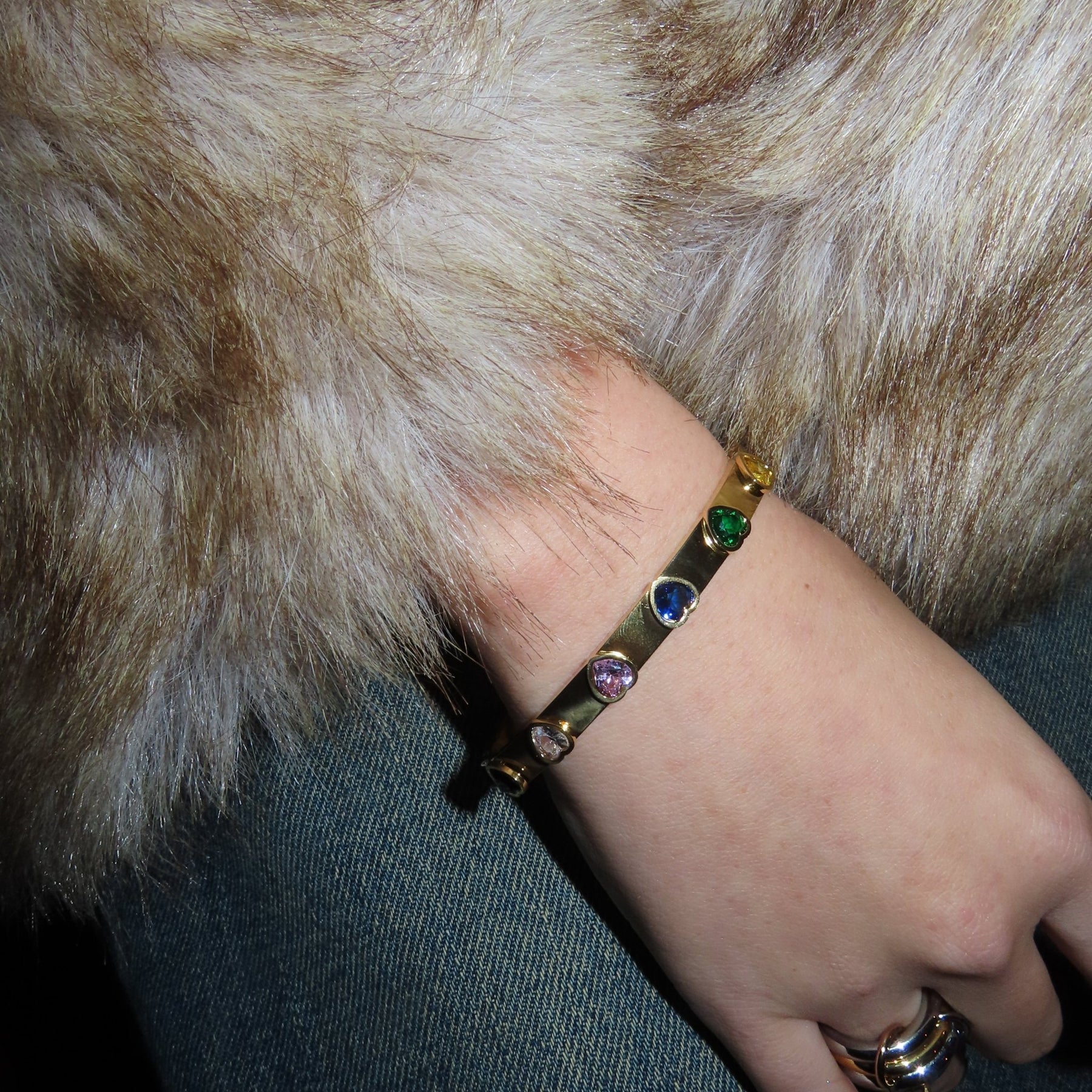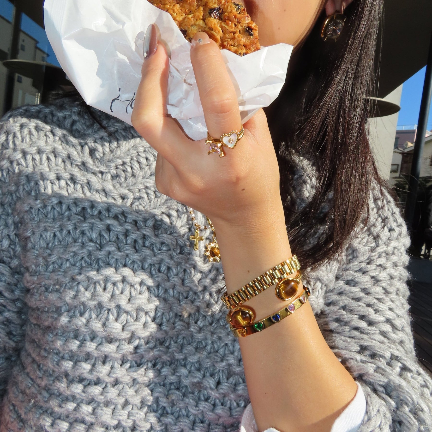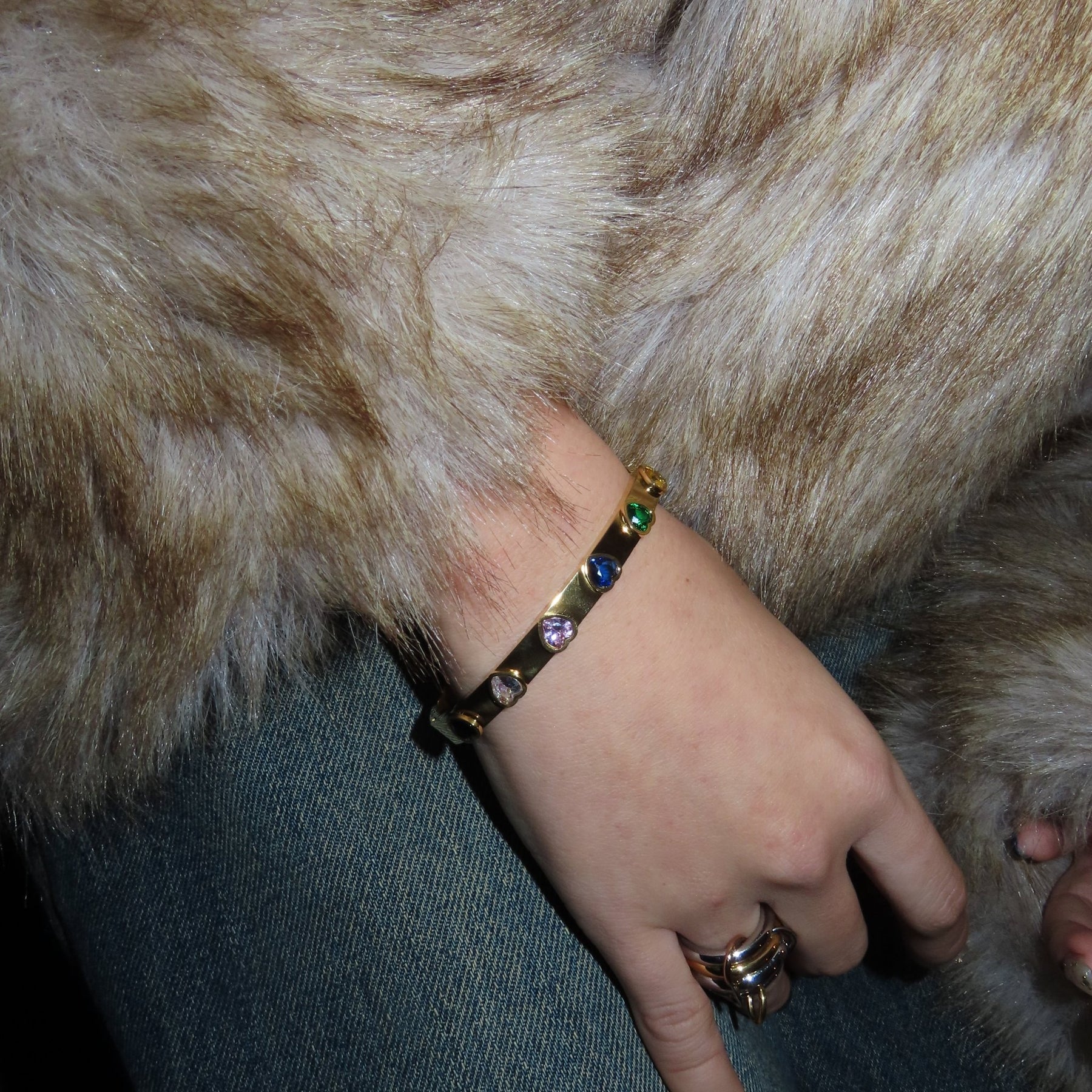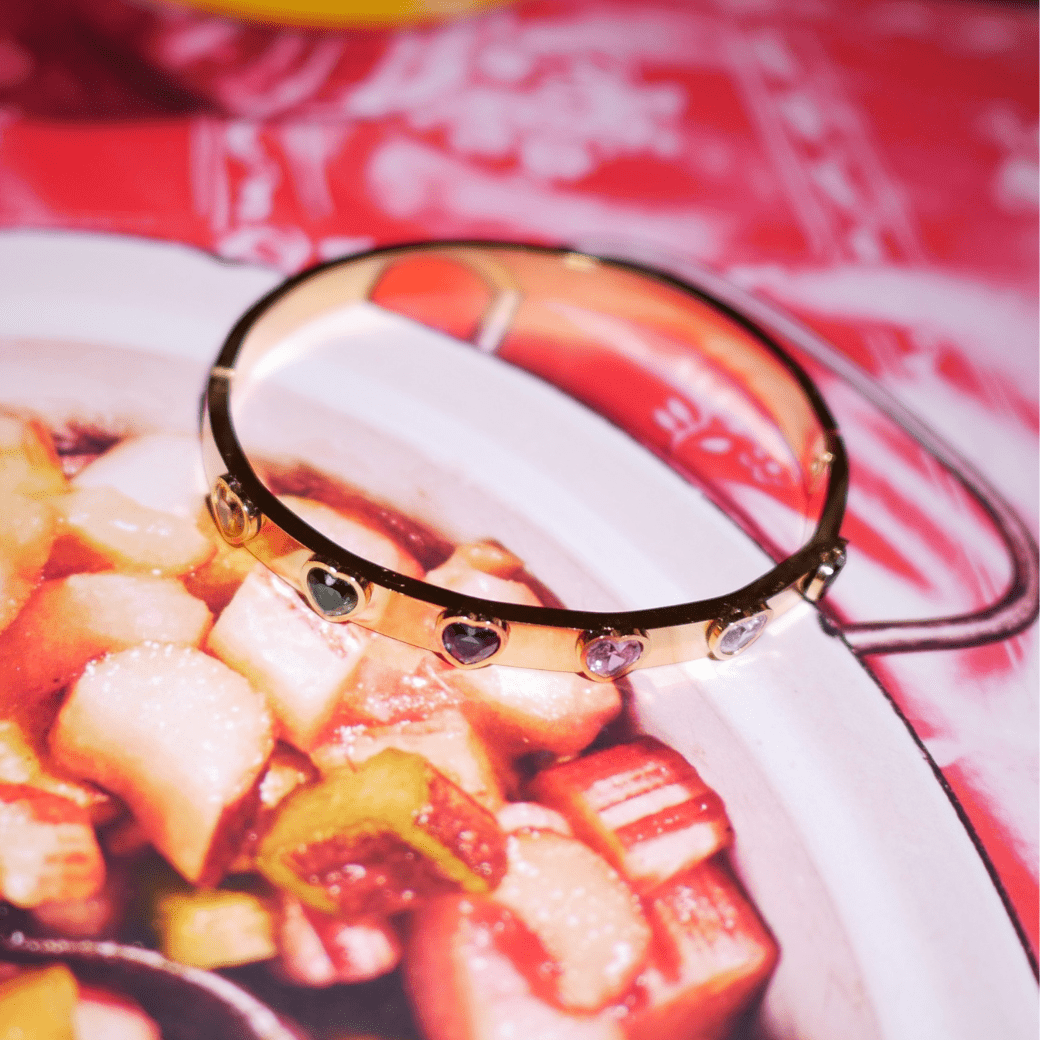 [DESIGN] A simple bangle with colorful heart-shaped zirconia embedded in it. This playful item goes perfectly with layering with other cool items. We recommend purchasing this together with other colorful items from HoneyButter Nine.
