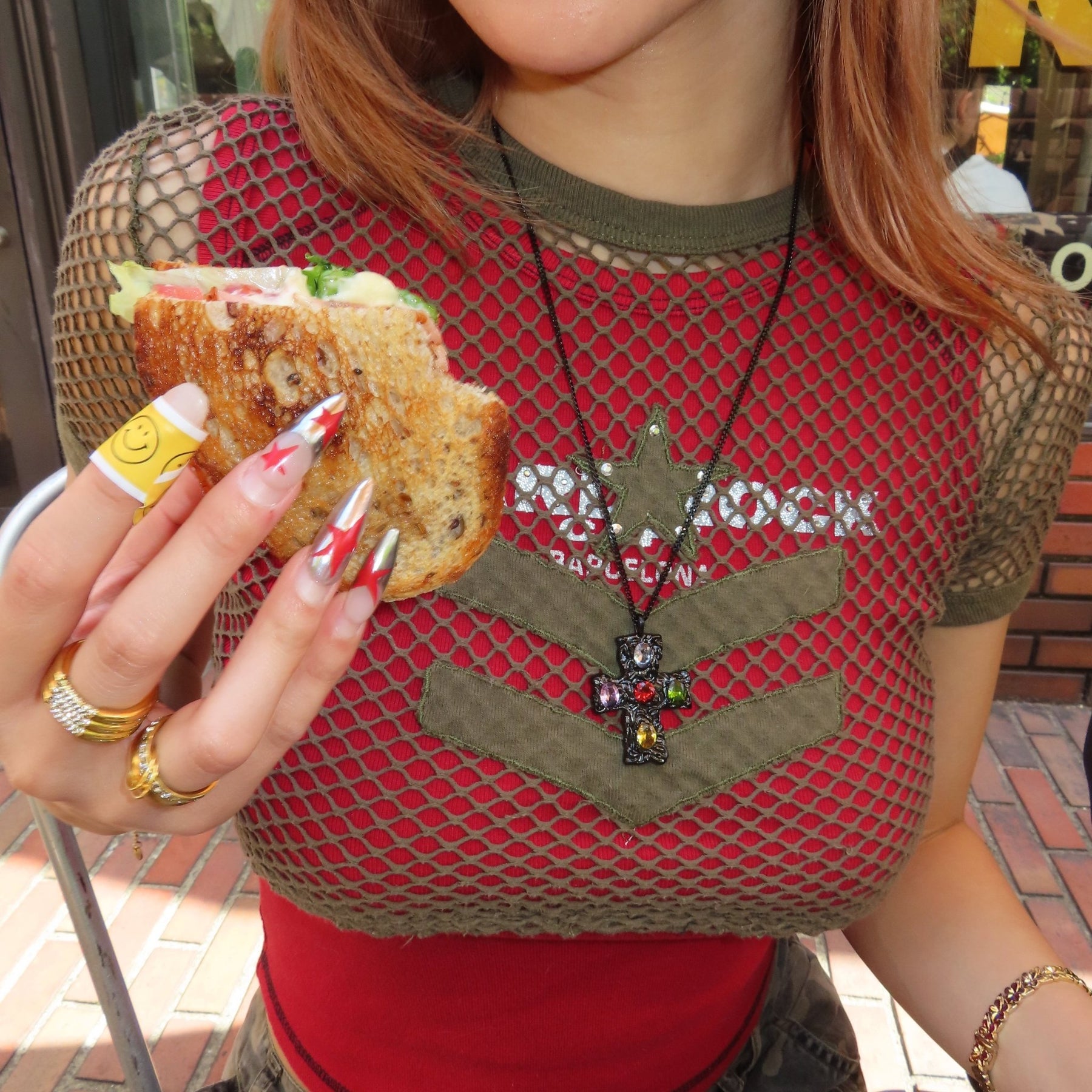 [DESIGN] A pendant necklace featuring a heavy cross and five colored stones. The bold and gorgeous design will stand out even in simple outfits, making it a great accent piece.